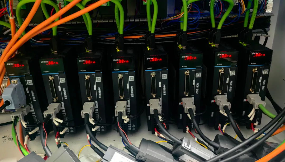 在廣東某數(shù)控廠車間里,每臺插件機(jī)采用9套ESS180N伺服與上位機(jī)進(jìn)行EtherCAT組網(wǎng)通訊,各個伺服在不同的工位分…