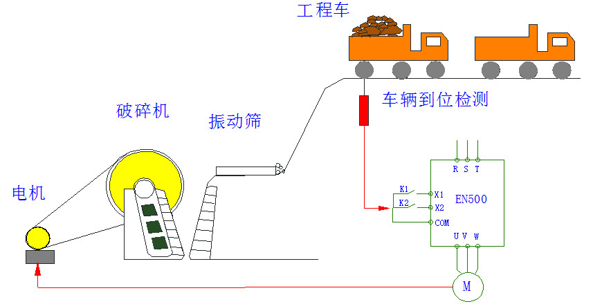 選擇EN500-4T450G/P變頻器,破碎石料運行50HZ,空載運行30HZ;運料車工程車卸貨處安裝位置檢測開關(guān),運料車到位輸出信號給變頻器,變頻器加速到50HZ,運料車離開經(jīng)過1.5分鐘結(jié)束破碎,變頻器減速到30HZ運行,周而復始。設(shè)置兩段加減速時間:第一段加速從0HZ到30HZ,設(shè)置加速30秒;第二段30HZ到50HZ加速20秒,從50HZ到30HZ,減速時間40秒。